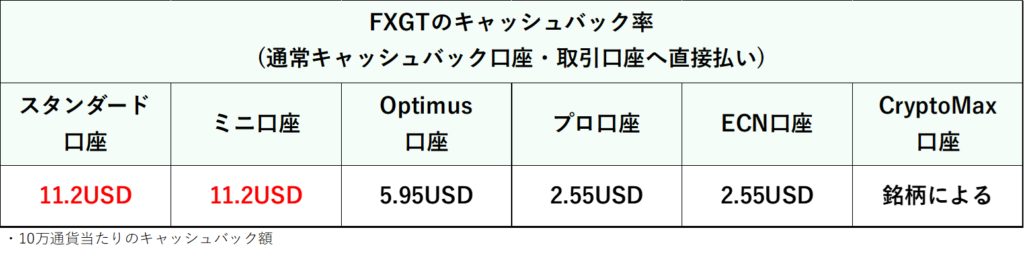 FXGTのキャッシュバック口座は、通常口座と取引口座へ直接支払いの2種類あります。