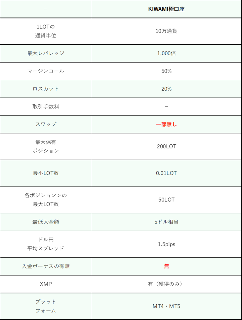 XMのKIWAMI極口座の特徴を表にしました。