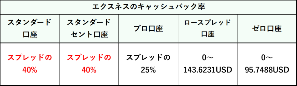 スタンダード口座・スタンダードセント口座はキャッシュバック率が一番高く、スプレッドの40%のキャッシュバックを獲得できます。