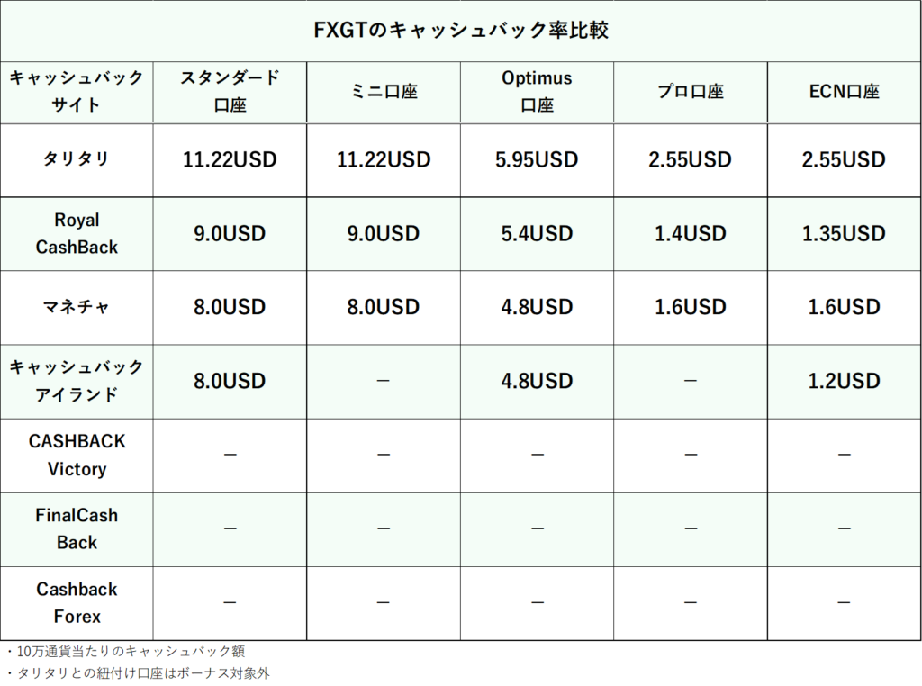 タリタリが一番キャッシュバック率が高い為、FXGTでキャッシュバックを受け取るならタリタリと紐付けすることをおすすめします。
