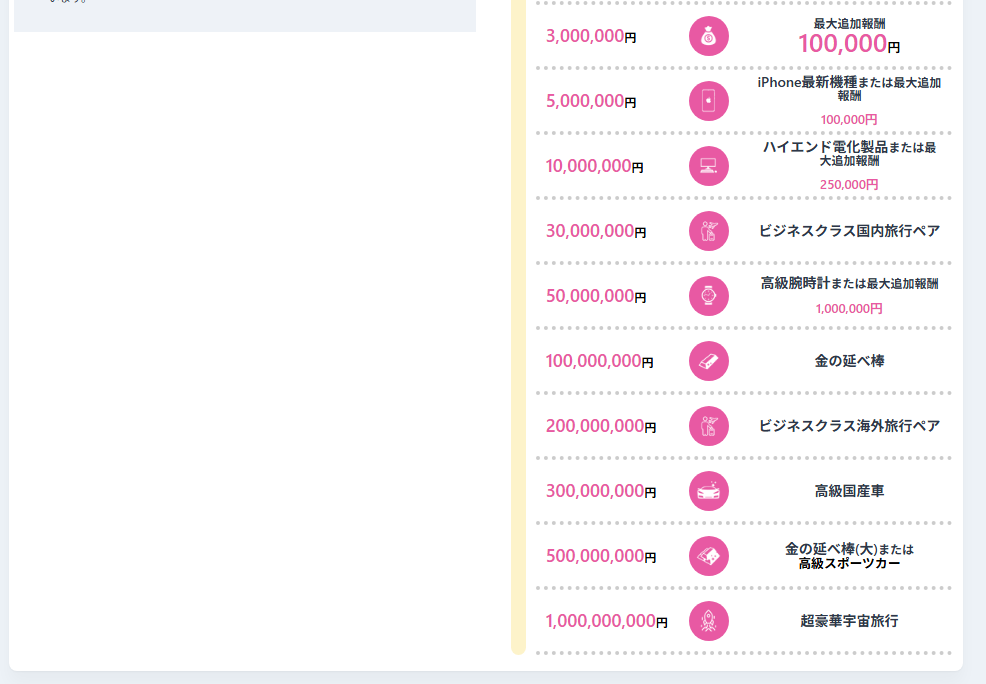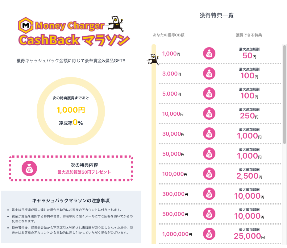 キャッシュバックマラソンとは、ユーザーが獲得したキャッシュバック金額に応じて追加報酬や豪華な景品を受け取ることが出来ます。