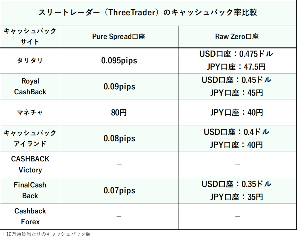 スリートレーダーのキャッシュバック率はタリタリが一番高く、ロイヤルキャッシュバックが2番目に高いです。