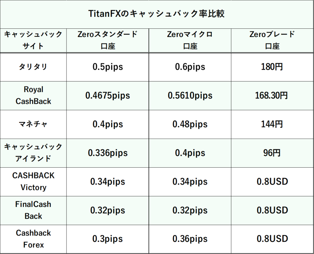 TitanFXのキャッシュバック率はタリタリが一番高く、ロイヤルキャッシュバックが2番目に高いです。
