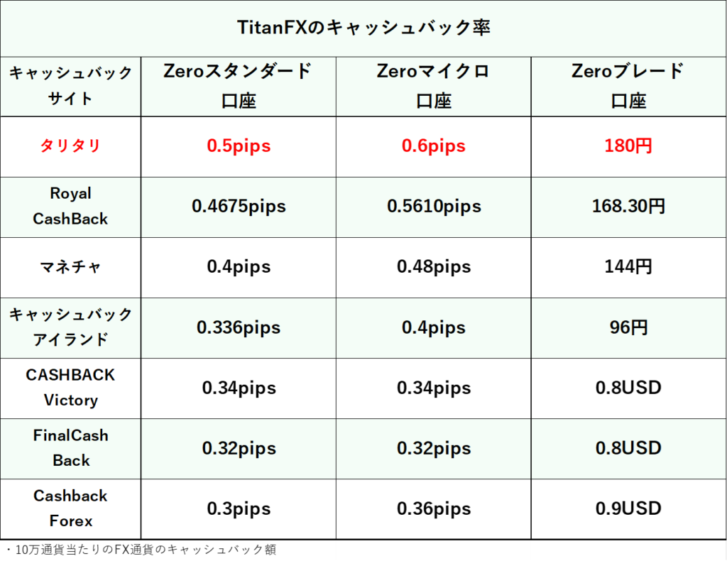 タリタリ(TariTali)と紐付けをしたTitanFXの口座はもともと狭いスプレッドと合わせてキャッシュバックを受け取ることが出来るので、取引時の実質コストをさらに減らすことが出来ます。