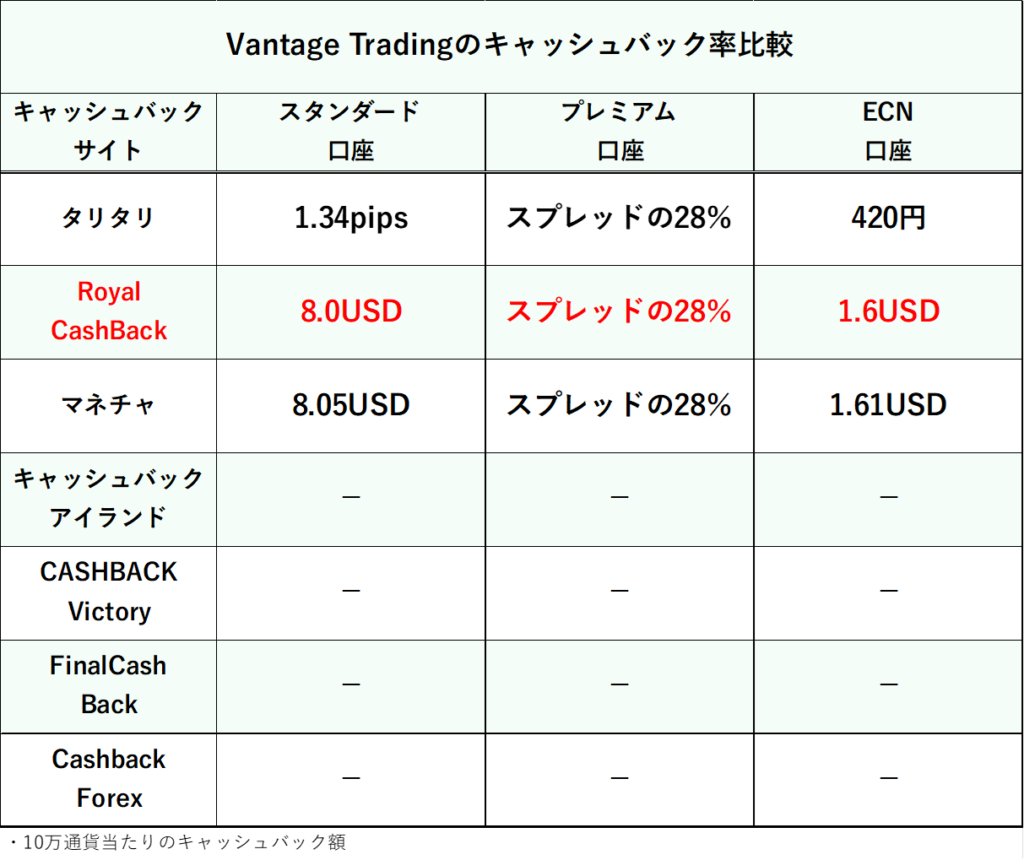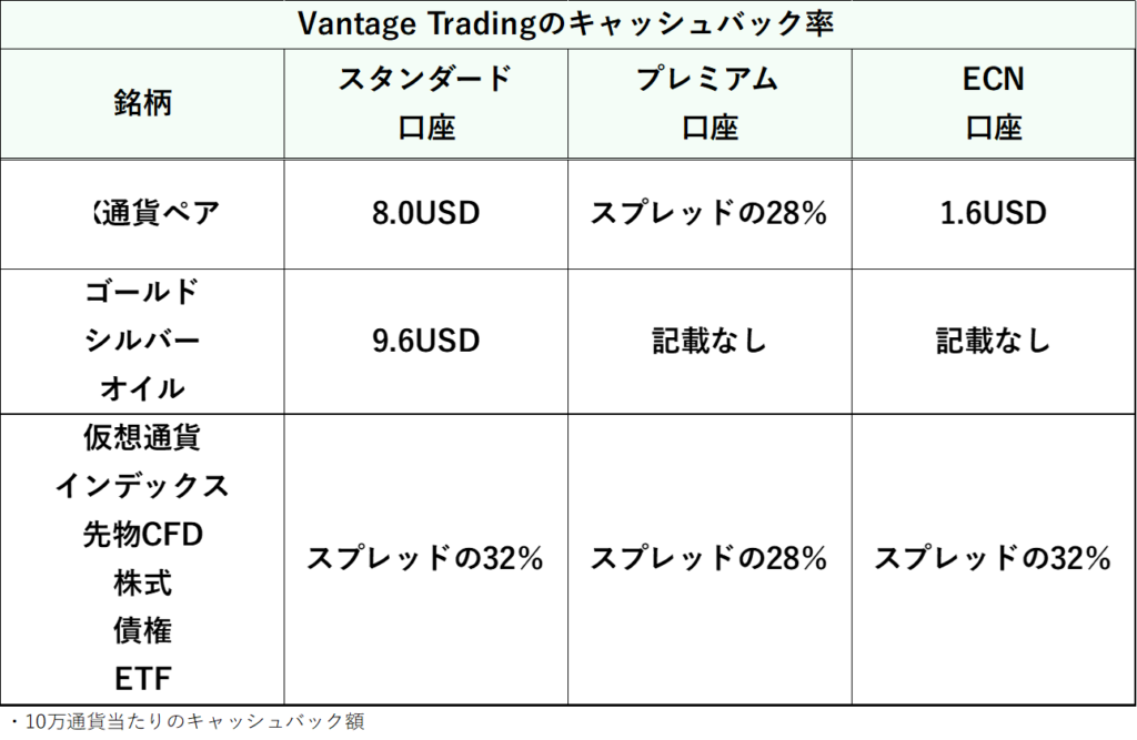 Vantage Tradingのキャッシュバック率